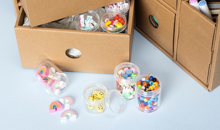 Chaque station créative possède un compartiment supplémentaire prévu pour un tiroir additionnel. Nous avons conçu des tiroirs adaptés à chaque type de station – vous pouvez ainsi ajouter plus de perles pour bijoux, davantage de matériaux pour le modelage ou des éléments pour la décoration textile. Nous avons aussi créé un tiroir universel qui convient à toutes nos stations créatives.
