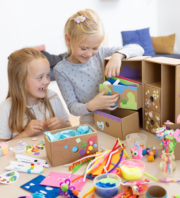 Il existe plusieurs boîtes My Craft Station, chacune contenant des matériaux pour un loisir créatif particulier. Choisissez votre préférée ou combinez-en plusieurs pour créer votre propre étagère créative. Chaque boîte est fournie avec un autocollant à placer à l’extérieur, afin que vous et votre enfant puissiez facilement reconnaître la bonne boîte à utiliser.